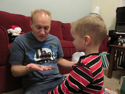 After church, we had visitors. First, Laurie and her family came to see us. They were so generous with presents, and we were glad to see them. Seth was thrilled with the remote control helicopter he got from them, but he was the only one that could fly it. Later Grandpa Ockey came and opened presents with us. The boys were really excited for the games from Grandpa, too.