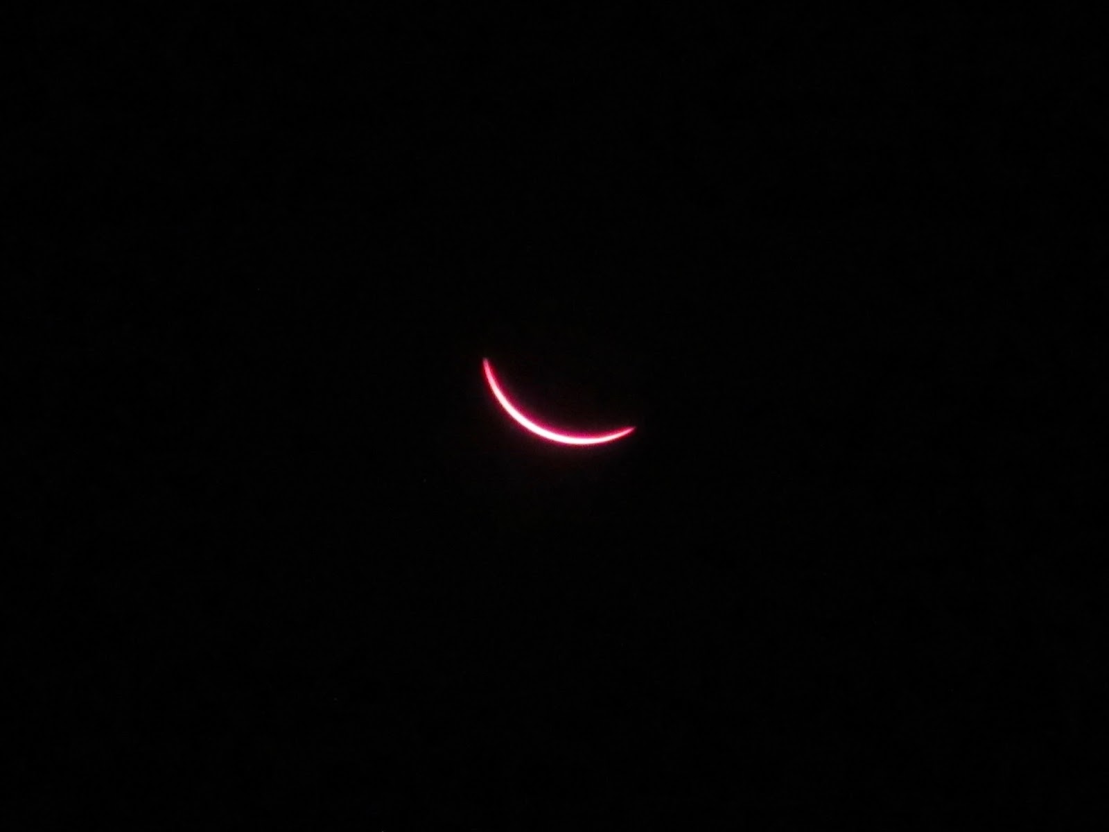 The eclipse started about 10:20 and peaked at 11:34. It would be in totality for only two minutes, and Dad planned to leave Steph's house by 11:40, so everything had to be ready. By 10 o'clock, the van was packed and we were in the backyard with Italian sodas, Starburst candies, Eclipse gum, and Steph's homemade Moon Pies. The buildup to the eclipse was awesome. The kids ran and played in the yard, we ate, and used our eclipse glasses to watch as the red disk of the sun was slowly overtaken by the moon.