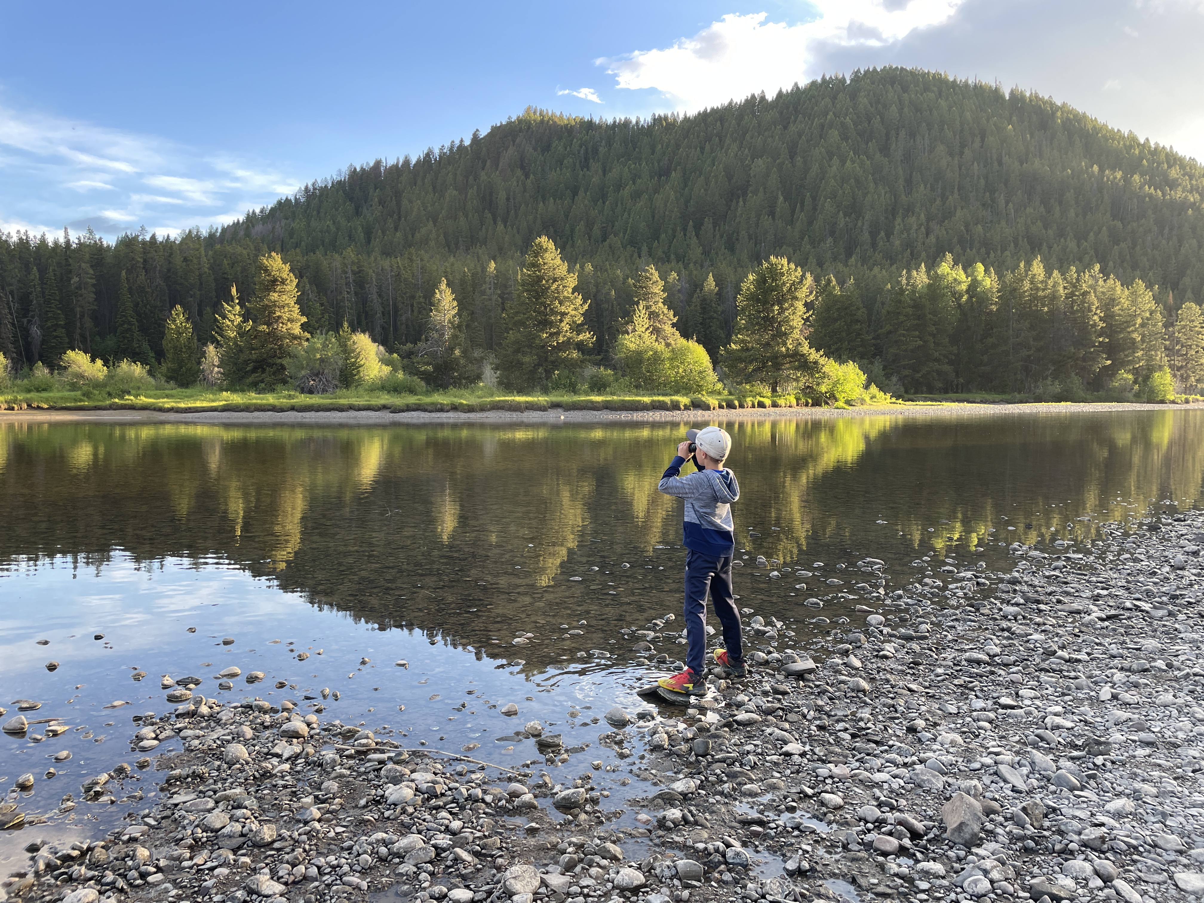 Mom made pasta on the camp stove right next to the parking lot on a picnic table. We ate really well and got all cleaned up in a hurry. When we are in the Tetons, the boys don’t waste a second. They just want to look for animals. This meant a drive out to Oxbow Bend. The water was really low, the lowest we’d ever seen it, but we did spot a lot of wildlife. Most amazingly, we saw another half dozen beavers. One sat on the edge of the pond not 20 feet from us. Some people got even closer, but we didn’t want to make the beaver nervous. He just chomped on his stick and ignored all of the humans. We got home late, but the cabin in the Tetons was really snug for the five of us. It had been another great day!